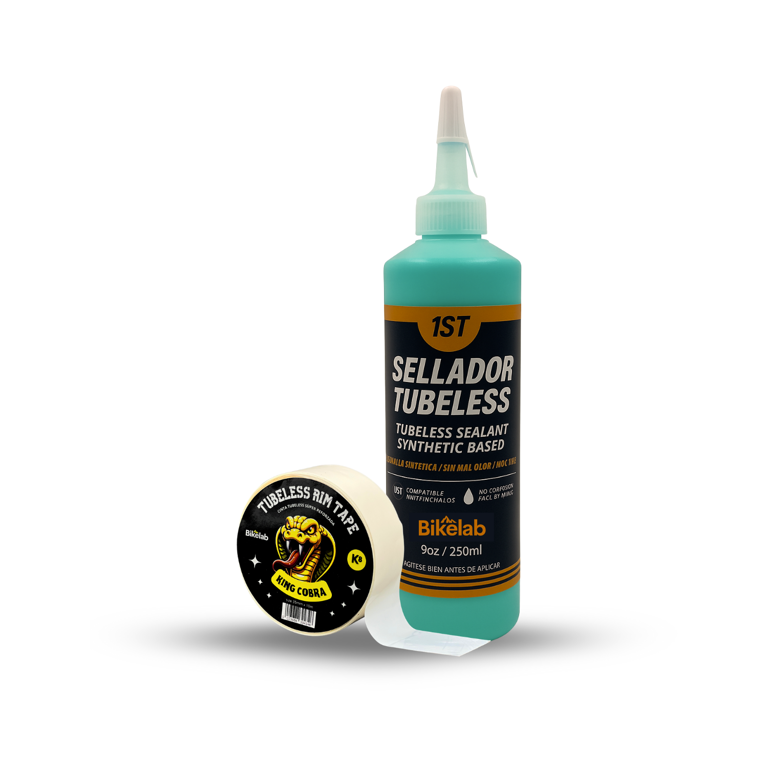 Kit Tubeless Bikelab — Incluye Sellador 250 ml con fórmula de látex natural y Cinta Resistente 35 mm de alta adherencia. Sella pinchaduras de hasta 8 mm y garantiza un sellado hermético profesional. Ideal para MTB, ruta, gravel y e-bikes. 🇲🇽💪